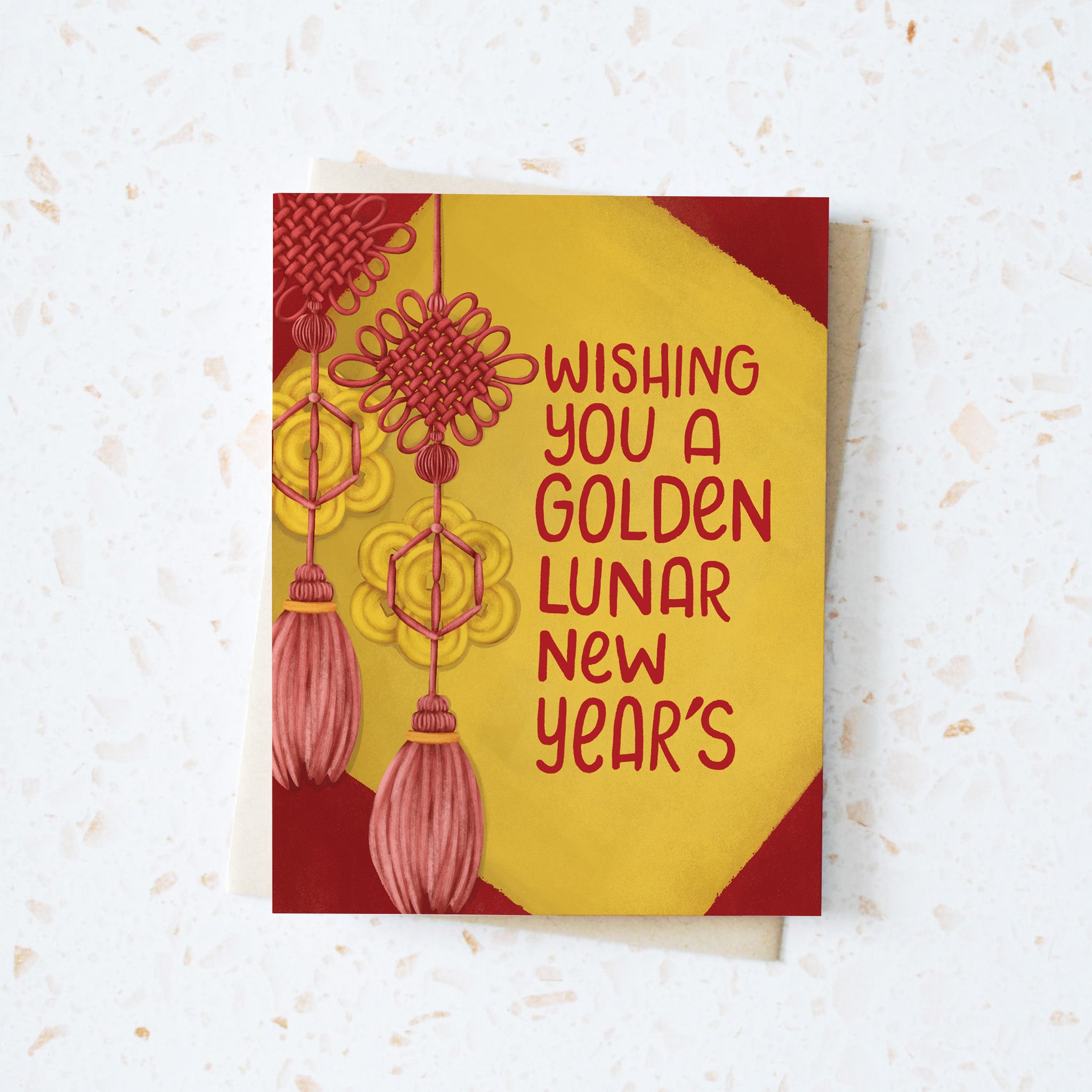 Celebrate the Lunar New Year with this playful greeting card featuring a vibrant red string and tassel, adorned with an ornate Chinese feng shui coin knot. Symbolizing endless luck and prosperity, the decorative hanging showcases intricate good luck knots that bring joyful blessings. Perfect for sharing cheerful wishes and adding a touch of tradition to your New Year greetings.