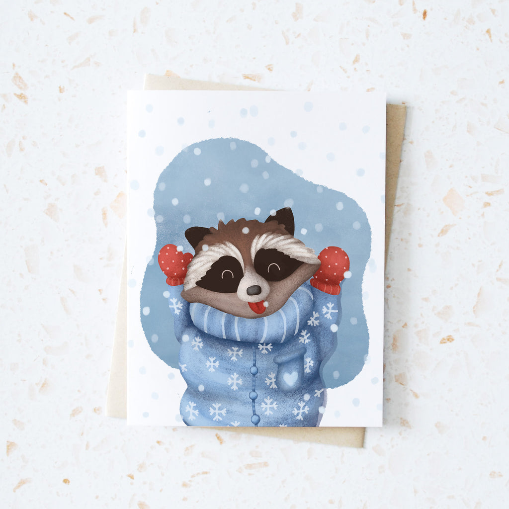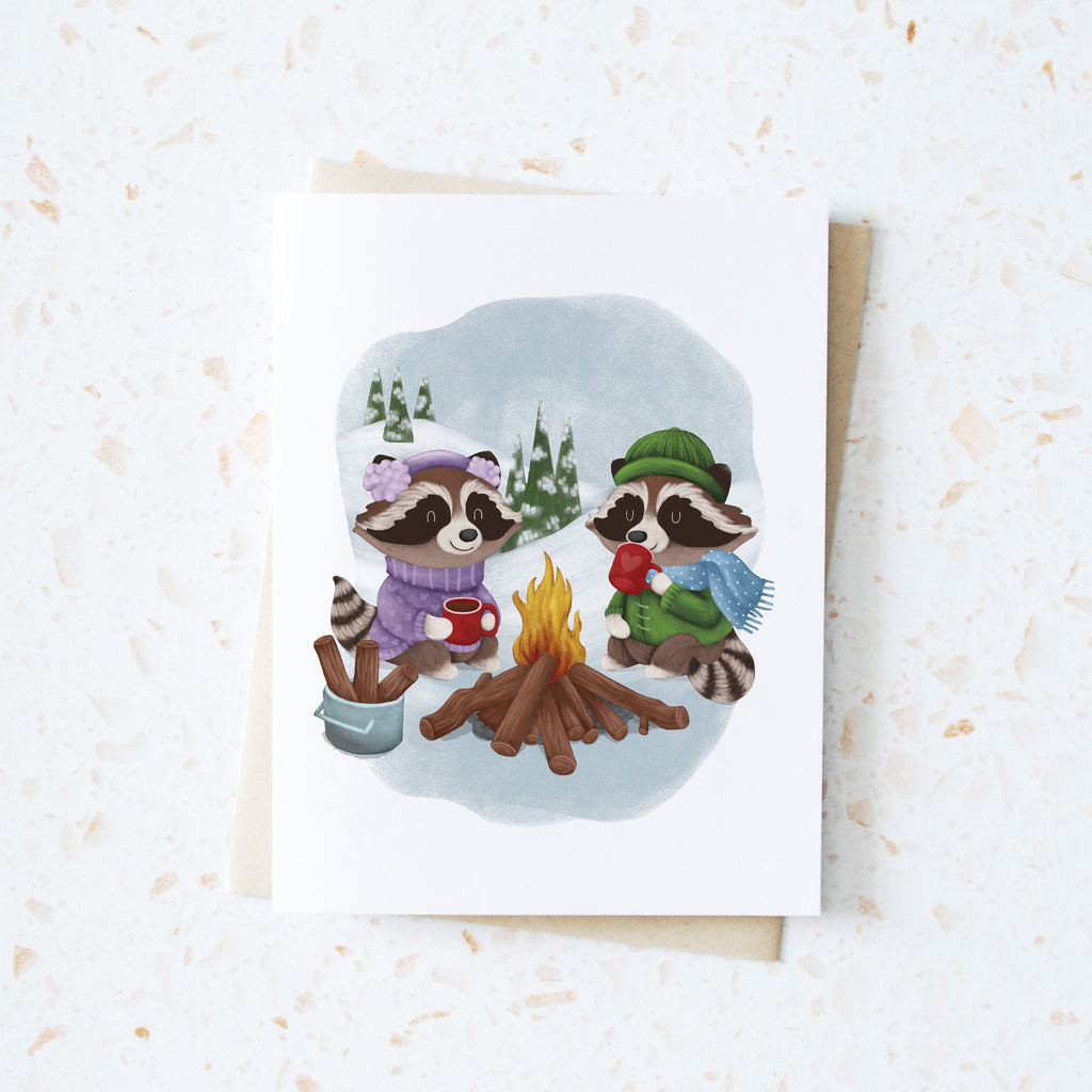 Cozy Raccoons, Cocoa and Christmas Camp Fire Greeting Card
