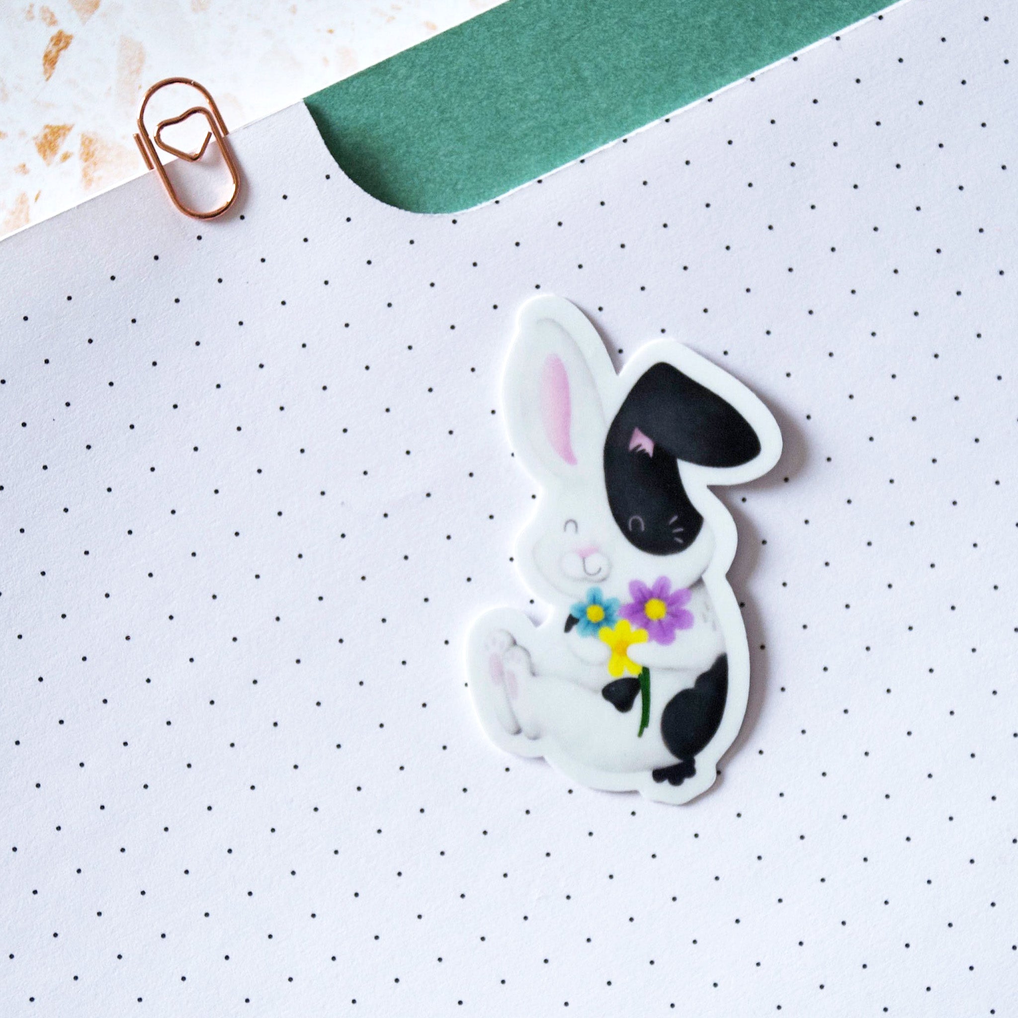 Add a touch of whimsy with this playful black and white bunny vinyl sticker! Featuring an adorable rabbit clutching a bouquet of flowers, this kawaii design brightens up laptops, water bottles, and notebooks with charming simplicity. Durable and easy to apply, it’s the perfect fun accent for any space.